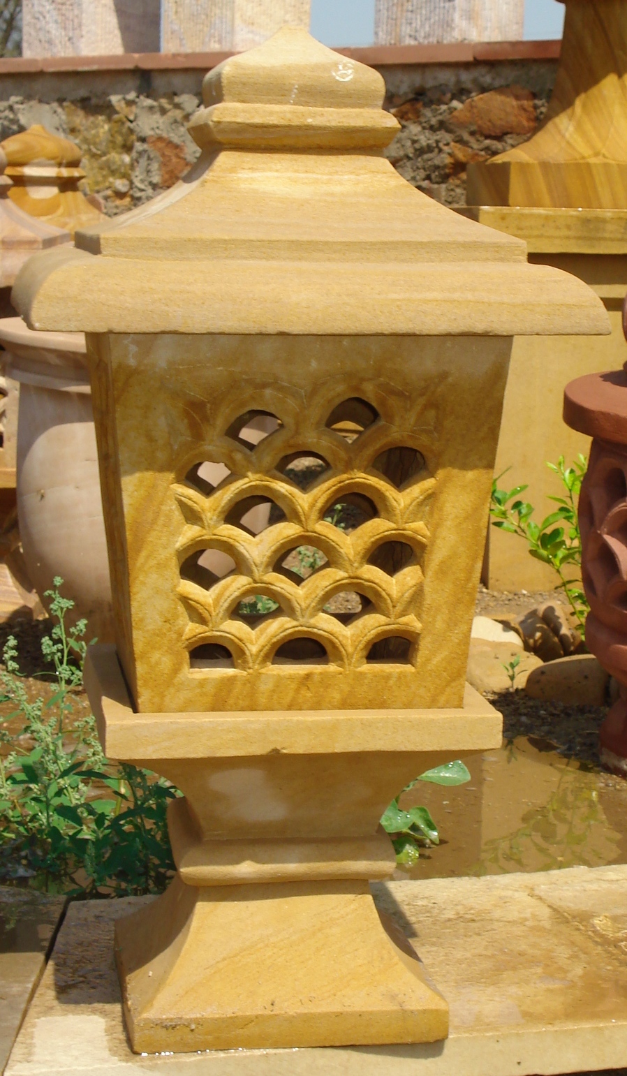 This is three pieces stone work. It has pedestal with simple, grilled and attractive lamp shade on top of it. It id ideal to be placed on walls or at any corner of garden. It is available in different colour.